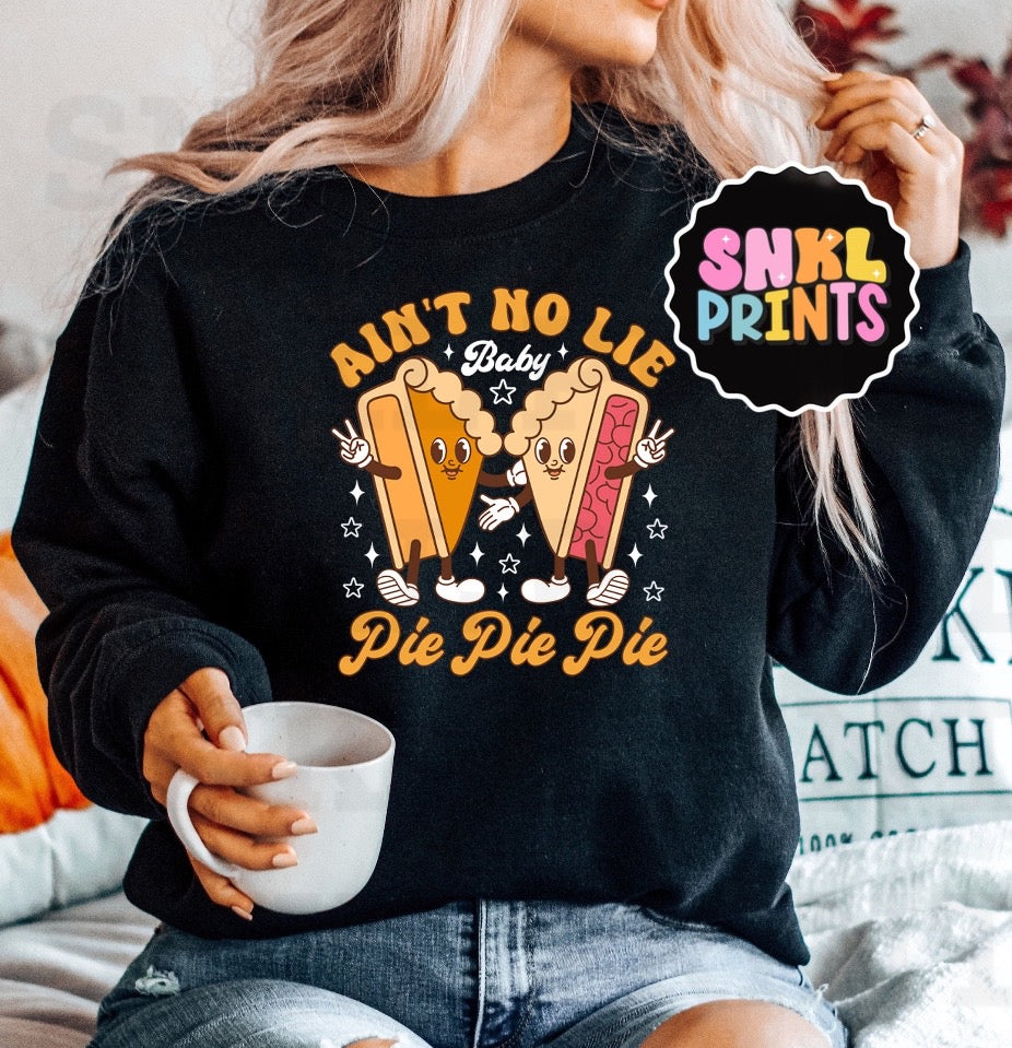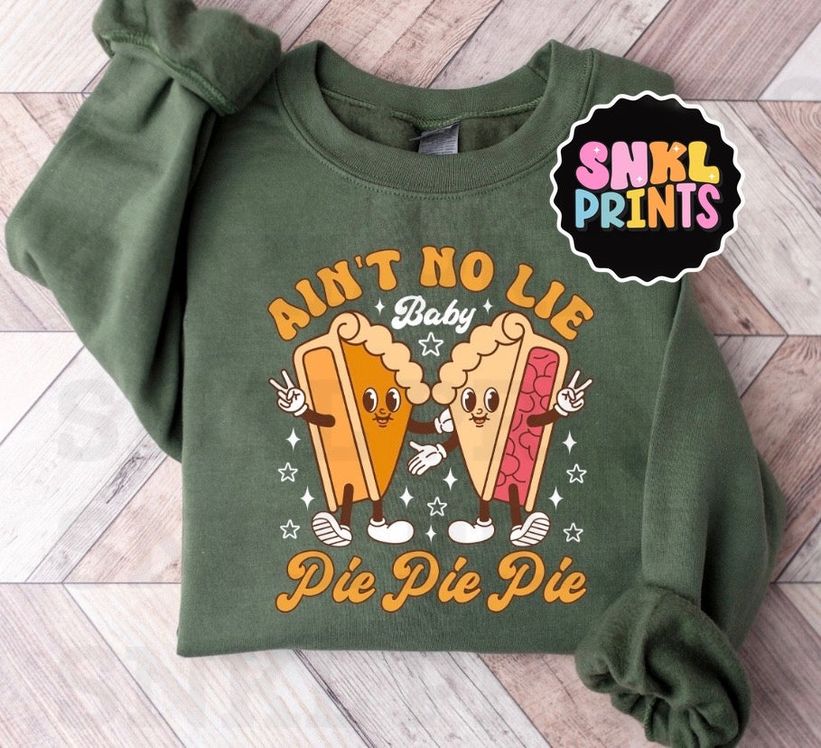Cute t-shirt for all ages, featuring a punny play on words. Ain't no lie, this shirt will have everyone craving some pie pie pie. Perfect for kids and adults alike. (No lie!)
