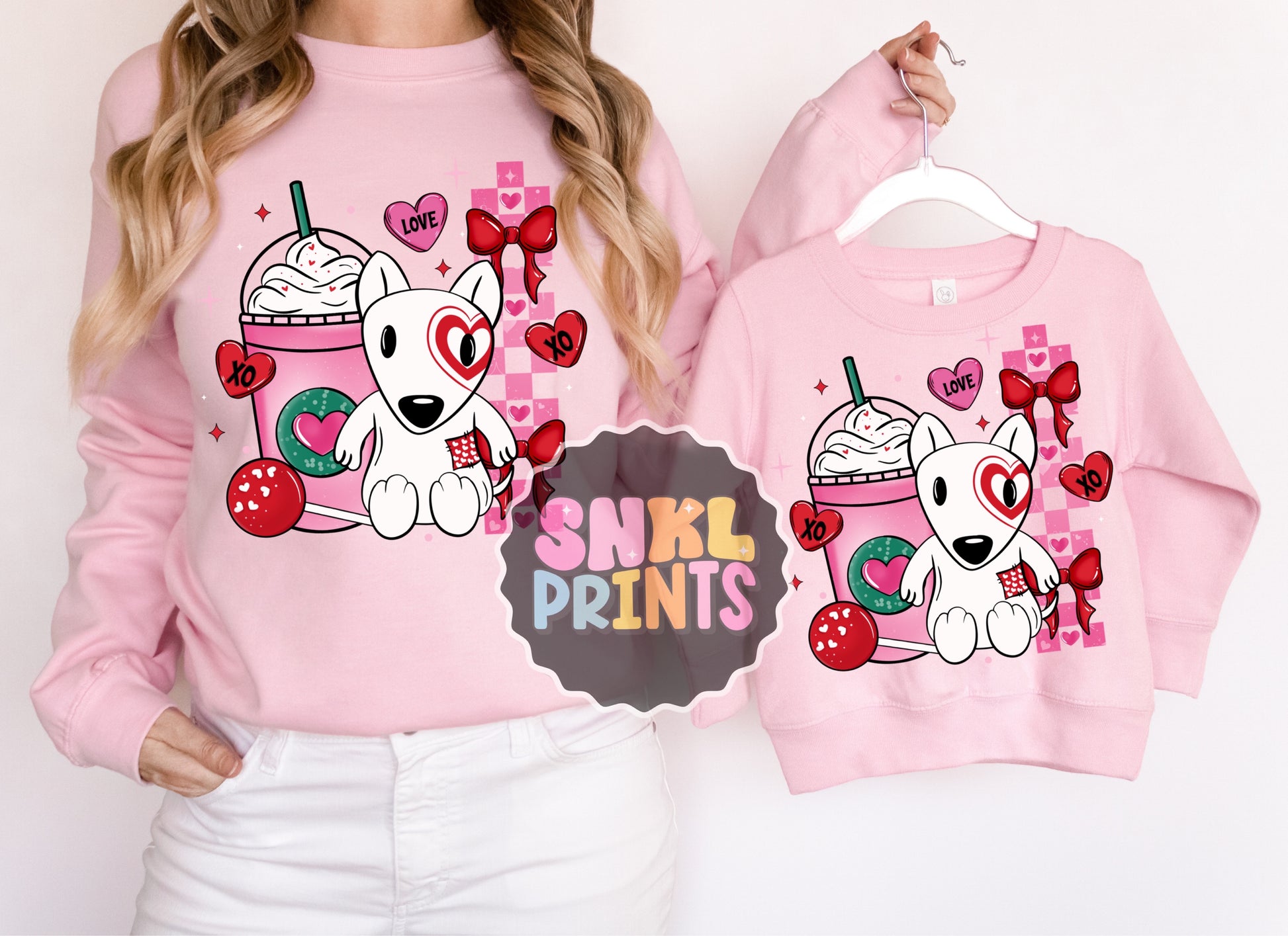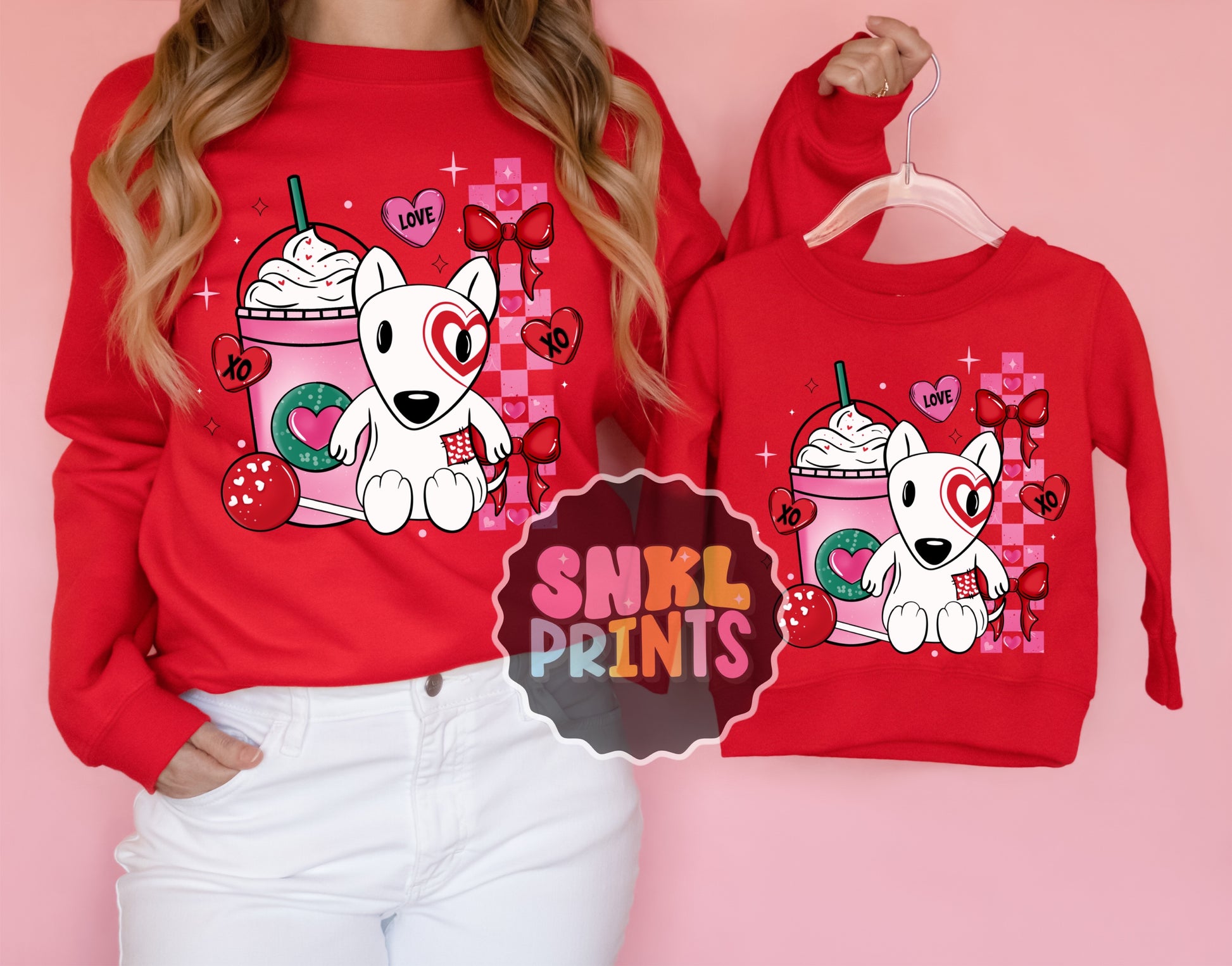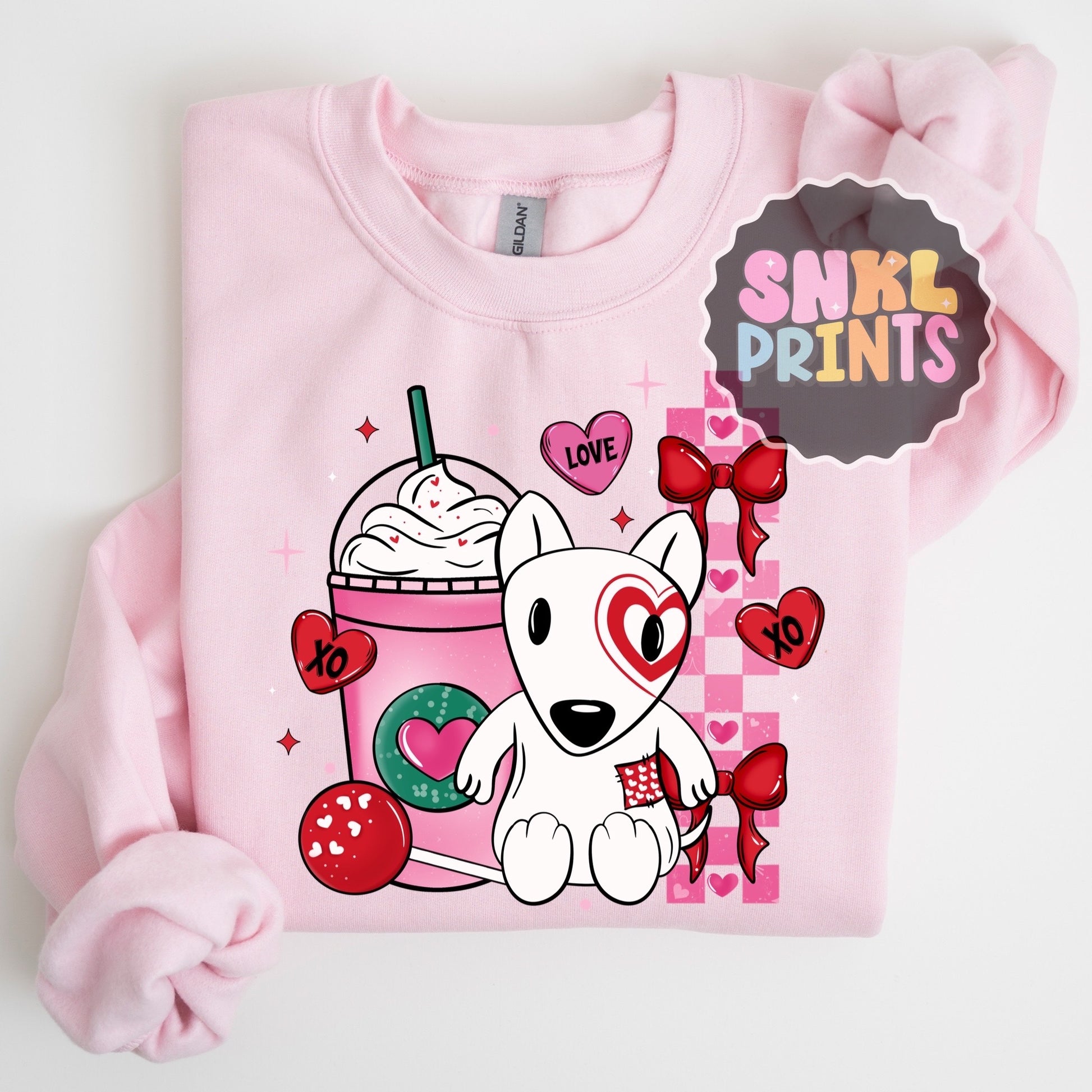 Get ready to hit the target of love with our Bullseye Valentine's Day shirt and sweatshirt! Featuring the iconic Bullseye dog from Target, this fun and playful design will have you feeling extra loved this Valentine's Day. Available for both kids and adults, spread the love in style with our unique and quirky shirt or sweatshirt.