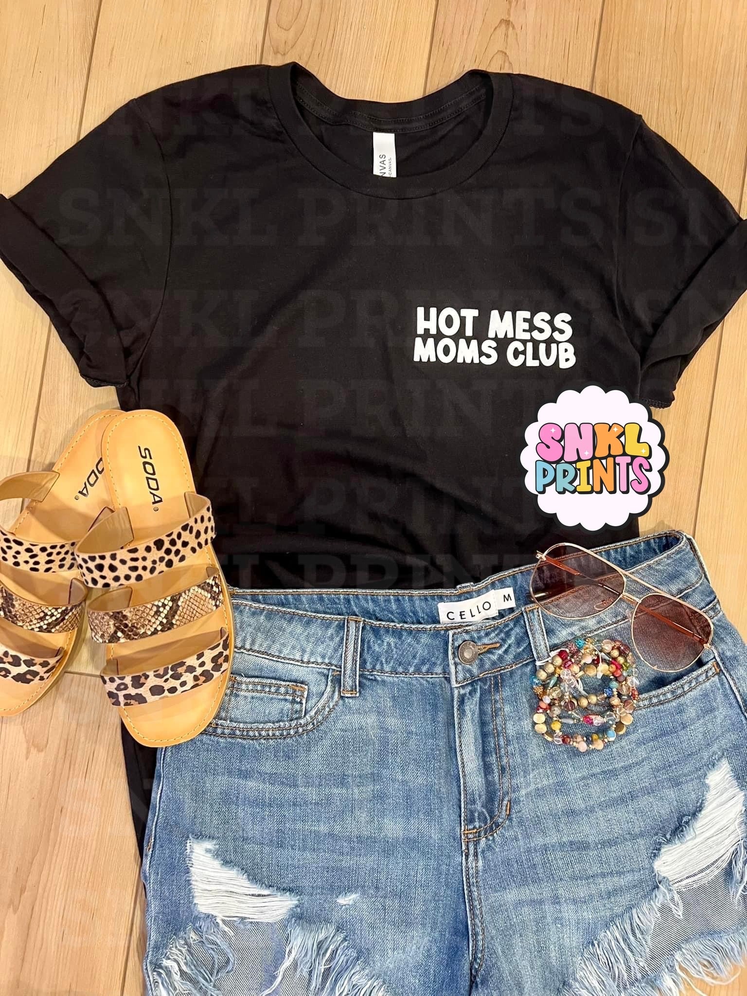 Join the Hot Mess Moms Club with this pocket tee. Perfect for the mom who doesn't take herself too seriously. Be a part of the club with our quirky, playful design and unique language. (No dad bods allowed!)
