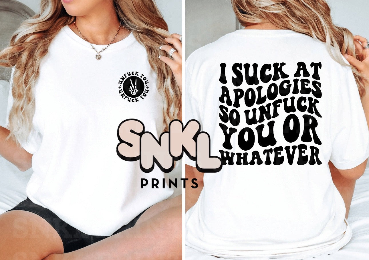 Unleash your playful side with 'I Suck At Apologies, So Unfuck You or Whatever.' Don't apologize when you can simply 'unfuck' the situation with this quirky product. No more boring and insincere apologies, this product lets you express yourself in your own unique way. Say goodbye to awkwardness and hello to fun!
