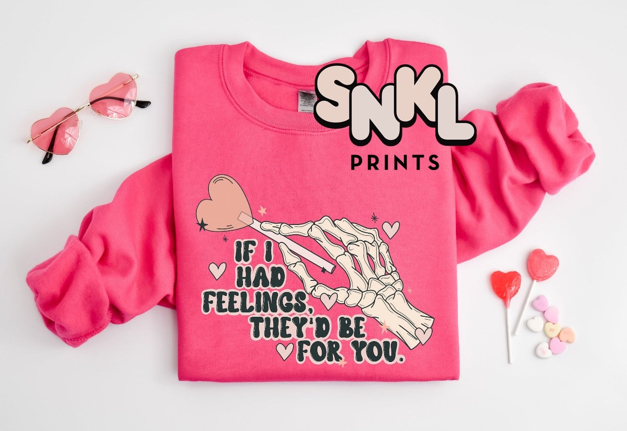Celebrate Valentine's Day in style! Show off your love in this quirky "If I Had Feelings They'd Be For You" shirt or sweatshirt. Perfect for those who don't take themselves too seriously, this shirt is sure to make a statement and bring a smile to your loved one's face.