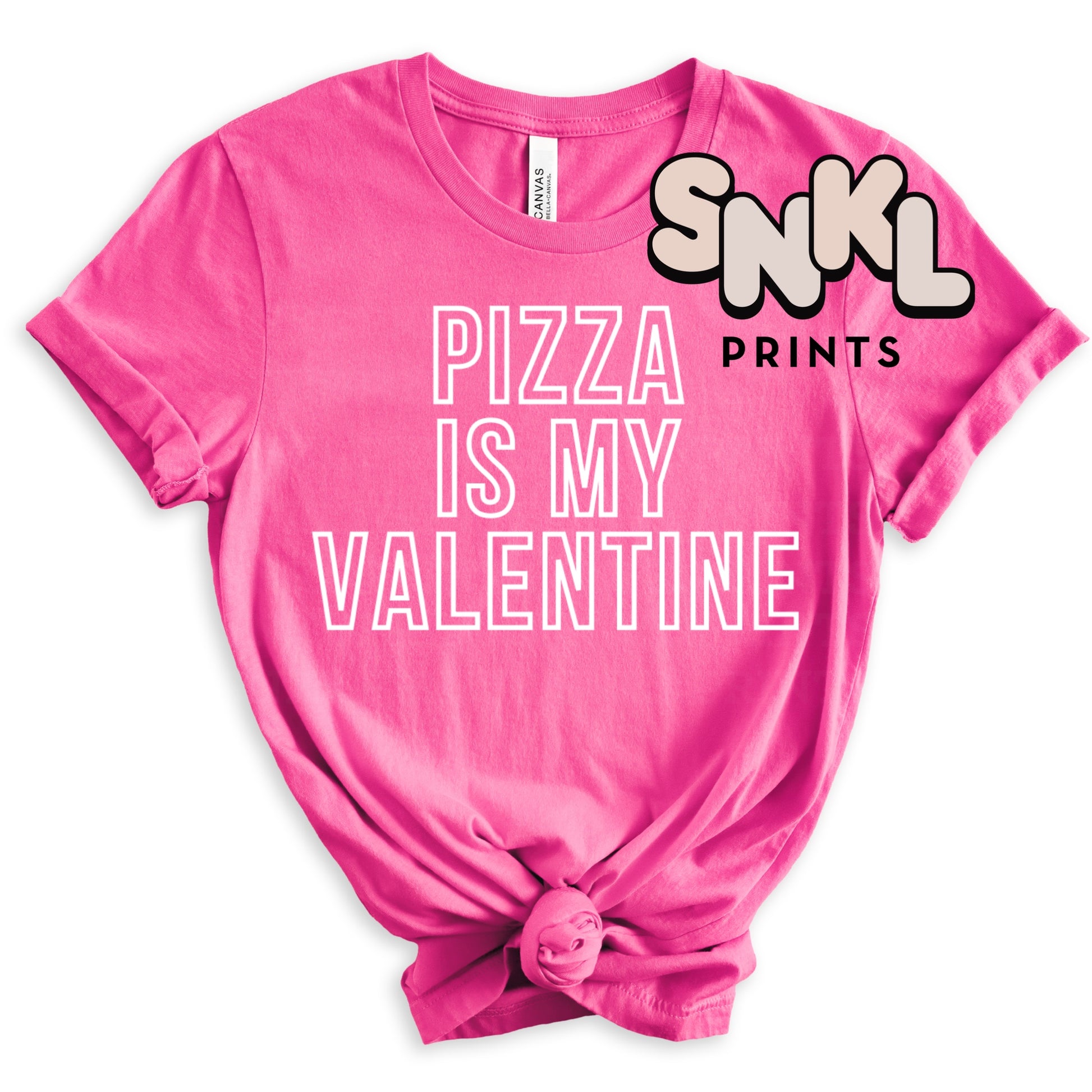 Declare your love for pizza with this quirky t-shirt! Featuring the message "Pizza is my Valentine", this shirt is perfect for any pizza lover. Show off your playful side and make a statement with this fun and unique shirt. (Order now and be the cheesiest valentine around!)