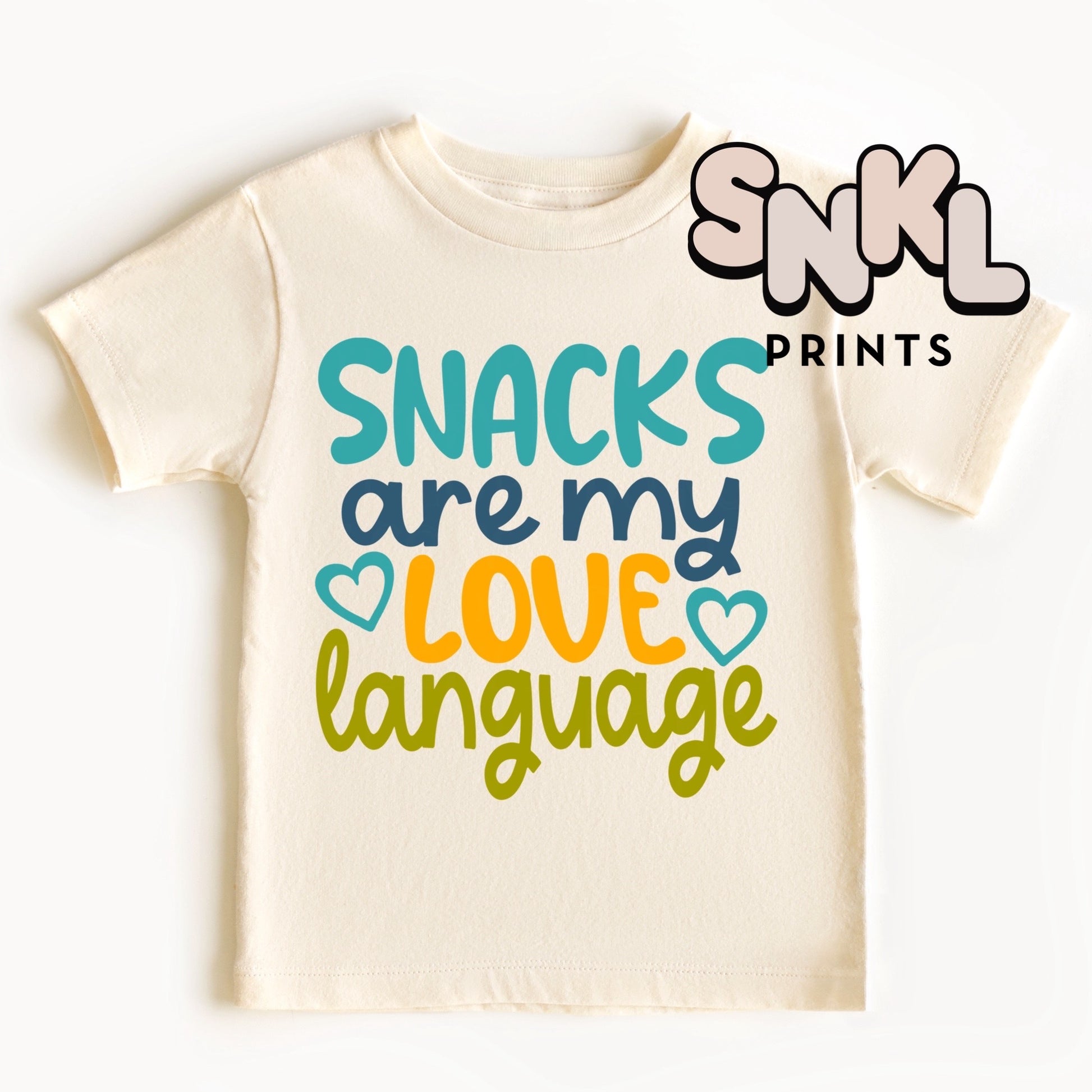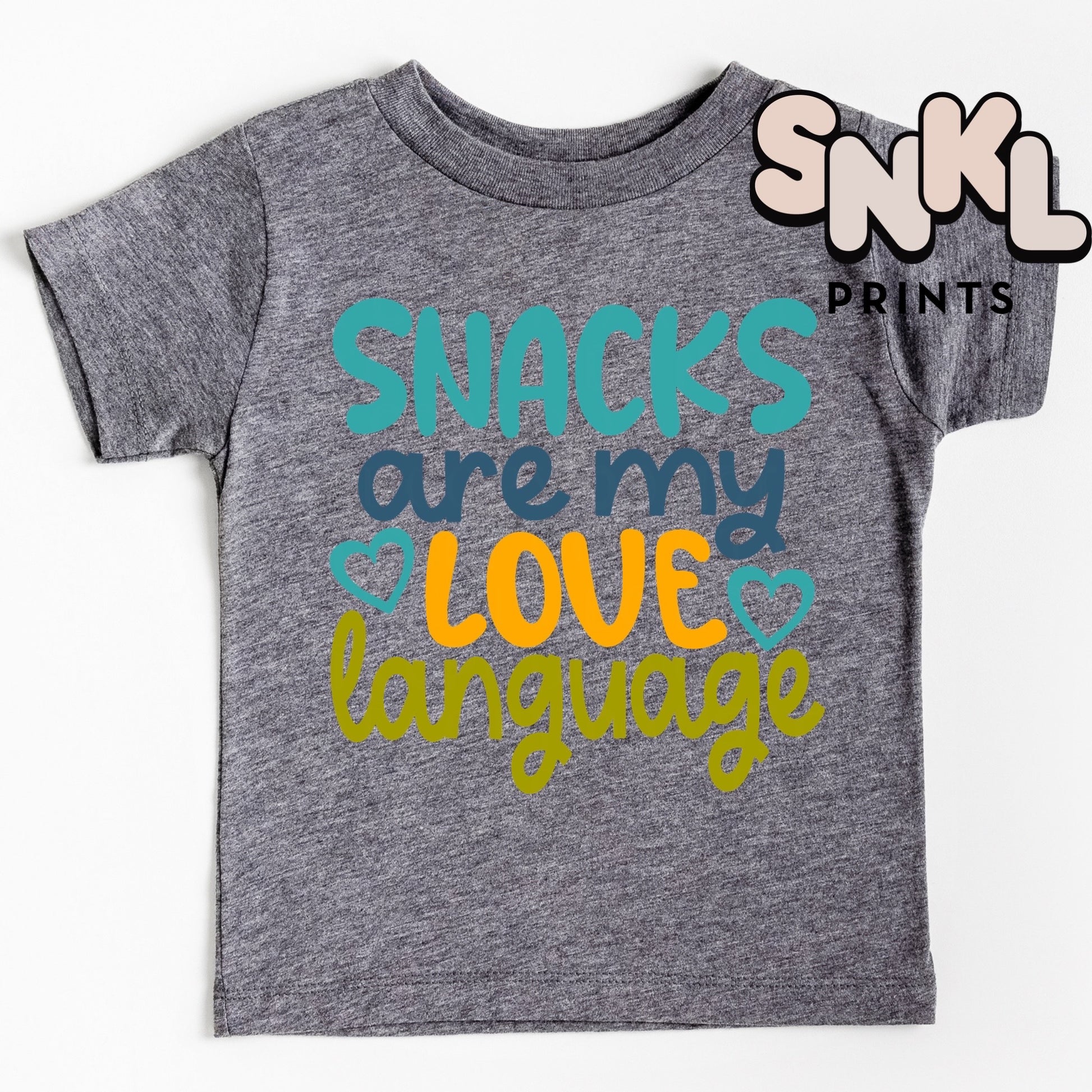 Love snacks? Show it off with this quirky shirt! The perfect gift for kids who love food and have a great sense of humor. Share your passion for snacks with the world and express your love language in a fun and playful way. (Food puns included!)