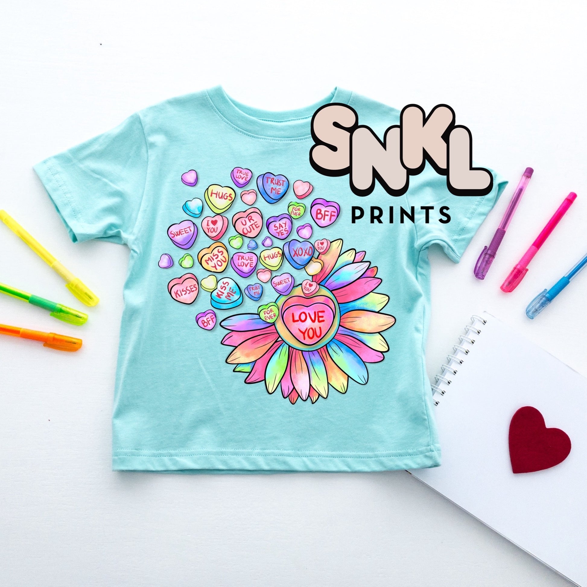 Make your child's wardrobe bloom with the Sunflower Candy Hearts shirt! Perfect for your little sweetheart, this shirt features a playful design that will have them smiling from ear to ear. Let them show off their unique style with this quirky and fun addition to their outfit. (Sweet!)