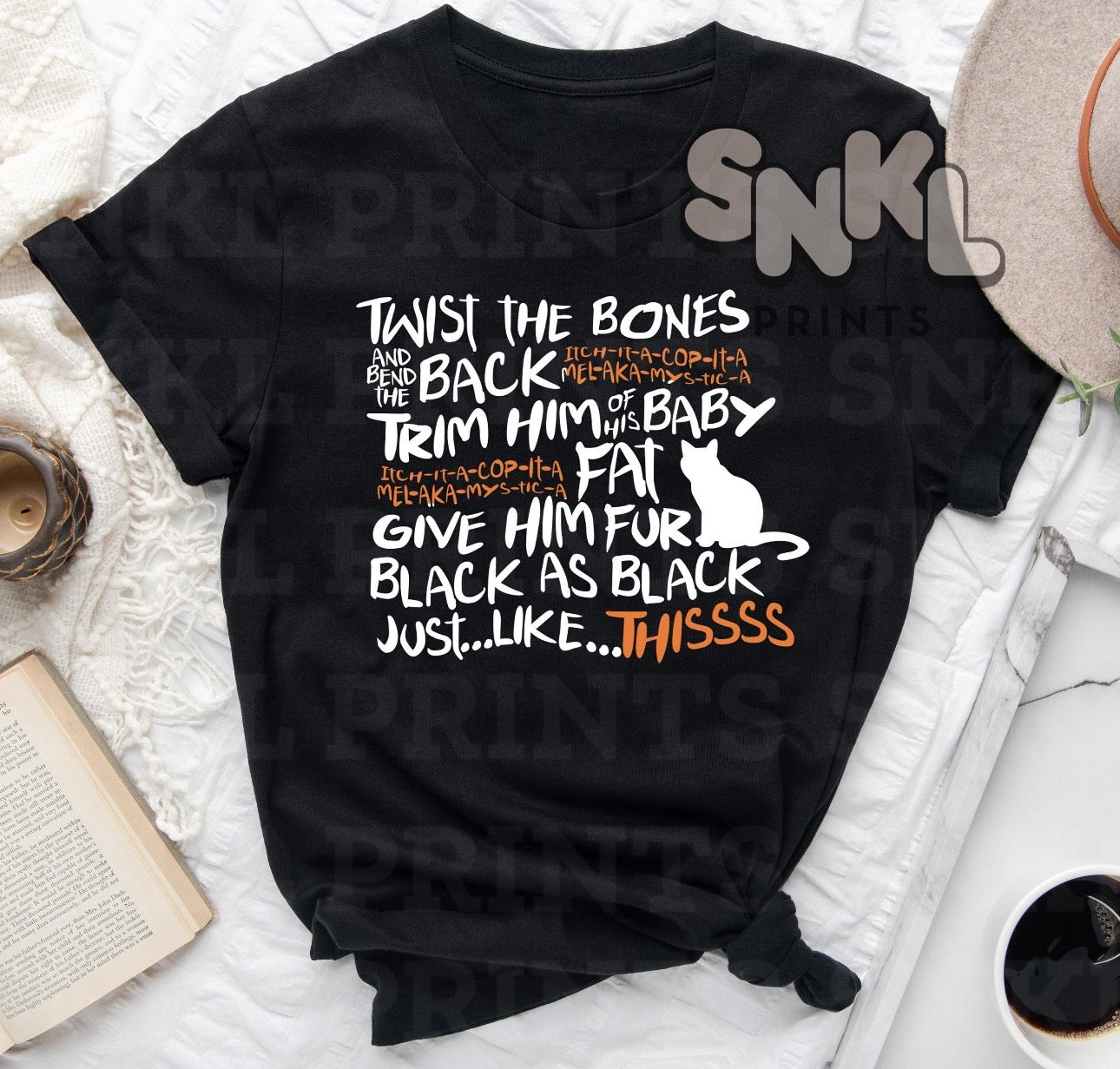 Unleash your inner witch with our "Twist The Bones & Bend The Back" shirt! Perfect for kids and adults alike, this shirt features a playful nod to the beloved movie "Hocus Pocus". Show off your fun and quirky style with this fun twist on a classic saying.